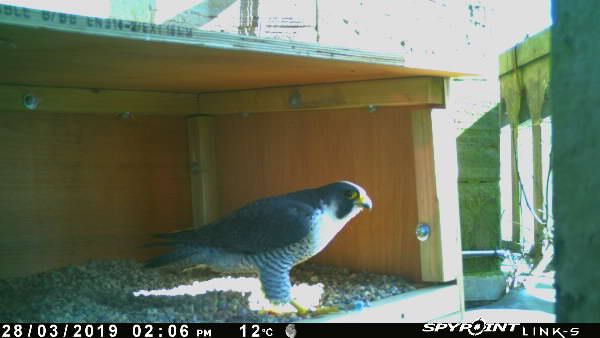 We designed, built and installed a peregrine nest box which soon became home to the resident pair of peregrines. Three eggs were laid and all three chicks hatched; however around day 11 one of the chicks died. The remaining two chicks flourished and were ringed at around 21 days old. A British Trust for Ornithology metal numbered ring and a coloured identification ring was fitted to both chicks. They were both sexed as males and were measured and weighed. Both chicks fledged in late June and are still occasionally visiting the nest box.